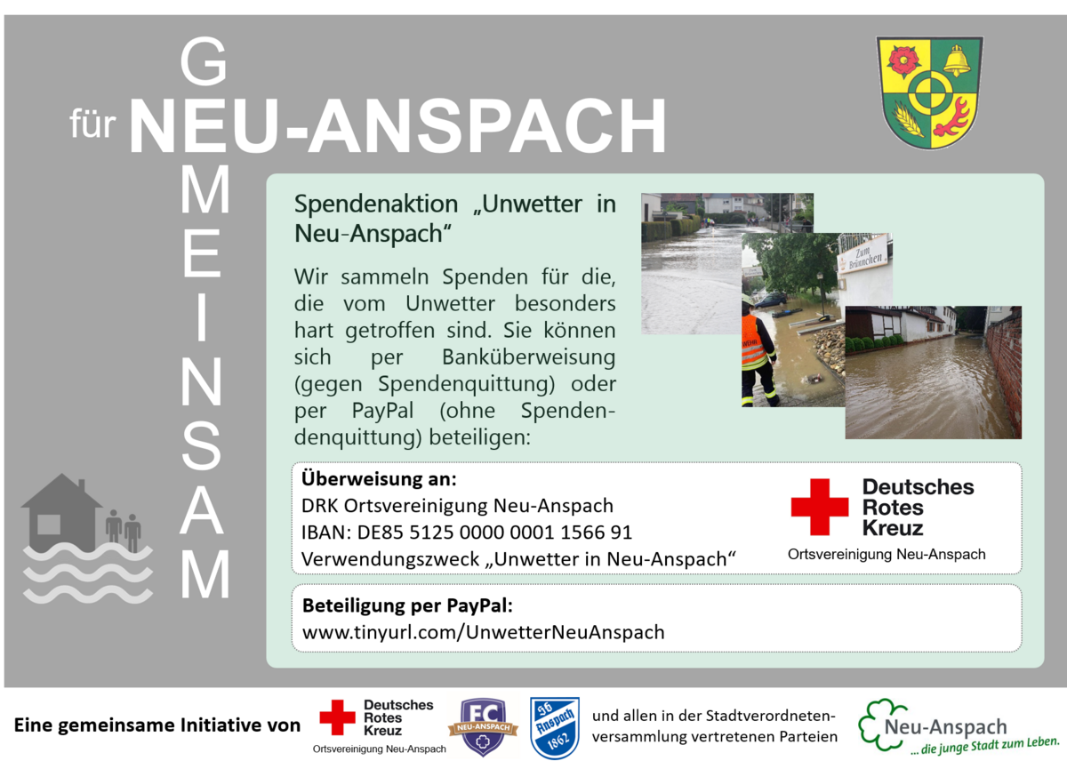Die SG Anspach, der FC Neu-Anspach, das DRK Neu-Anspach und alle in der Stadtverordnetenversammlung vertretenen Fraktionen haben sich unmittelbar nach dem heftigen Unwetter zusammengefunden, um zu besprechen, wie den Geschädigten schnell und vor allem unbürokratisch geholfen werden kann.